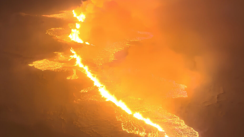 A volcanic eruption occurred in southwestern Iceland, near Grindavik, sending flashes of light into the sky and ejecting semi-molten rock. The eruption, about 2.5 miles from Grindavik, followed a November evacuation due to seismic activity. While the eruption on the Reykjanes Peninsula isn’t expected to release significant ash, it continues to draw attention. The nearby Blue Lagoon spa was temporarily closed due to earlier earthquakes. The eruption is gradually diminishing, with lava fountains now much smaller. Authorities monitor the situation closely, and tourists must follow safety guidelines as the eruption could change rapidly. Photograph: Marco di Marco/AP